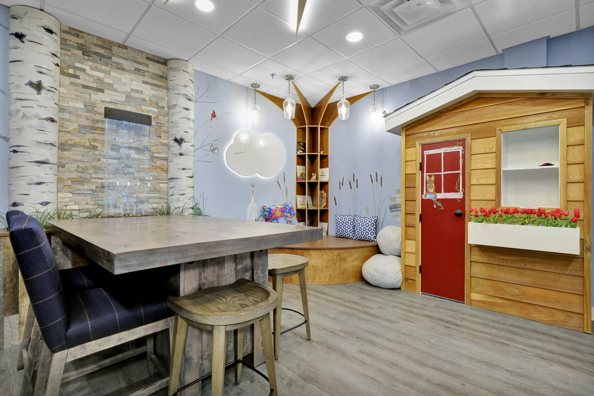 Ele’s Place, a healing center for grieving children and teens, dreamed of creating an open, safe, and warm intake space. Their current area was not only dated but felt cold and institutional. Could they design a space with a nature theme and artistic elements that would offer a sense of peace to the vulnerable? Could they create a reading nook in an indoor tree? Include the serene sounds of a water feature? House a large collection of children’s grief books among the sun and clouds and birch trees? As director, Kristine shared this vision with Michael, our owner and visionary, they connected on their own stories of loss and grief. There was a real connection. It was the start of a beautiful dream becoming a reality.