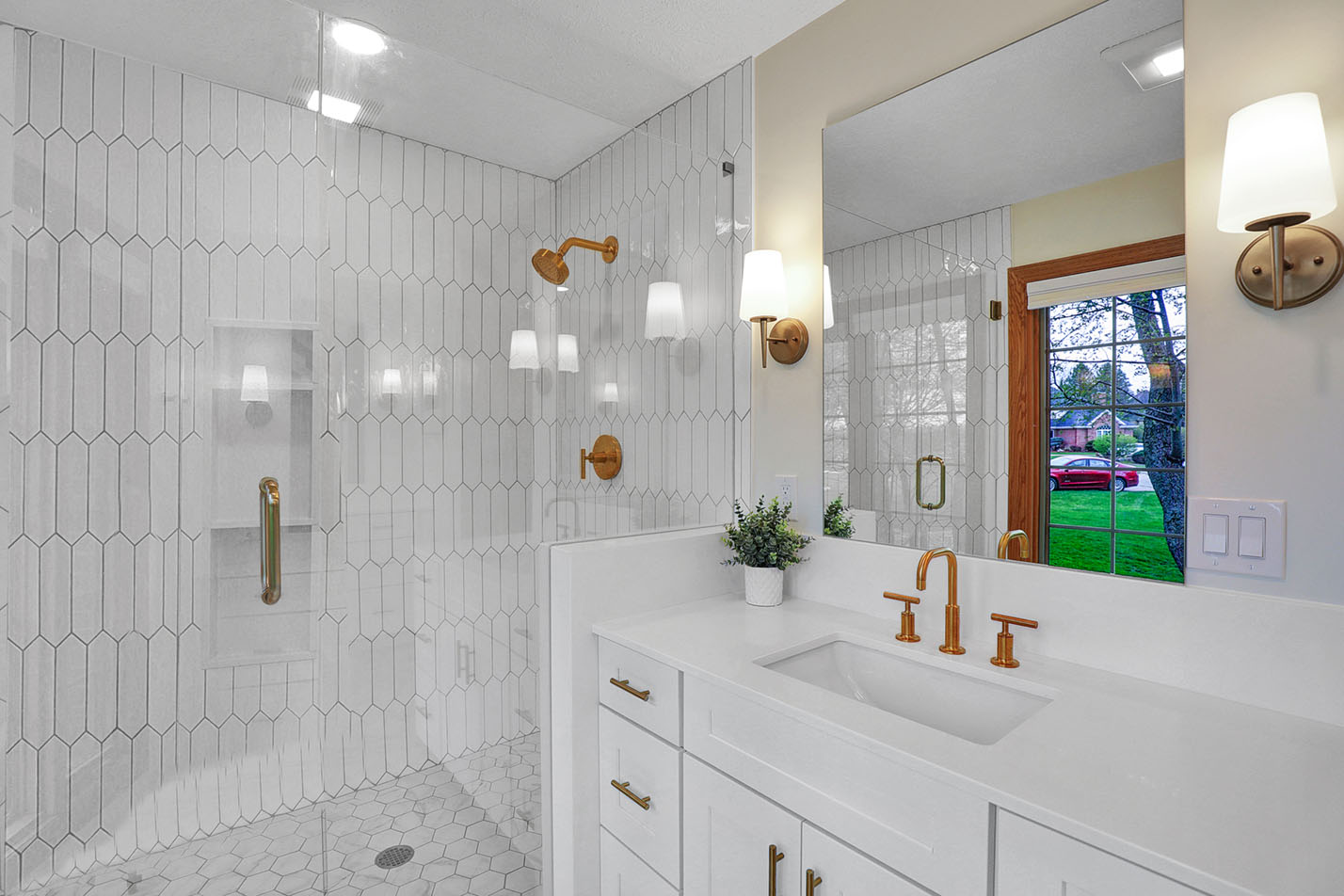 Constructed during the Covid 19 pandemic, there were already several challenges affecting this bathroom remodel, but other unique obstacles also came up. Building codes had changed since the initial home construction, requiring their low-setting windows to be paned with tempered glass. We worked with the building department to resolve the issue with the application of a film that met the safety requirements without the added cost and seal breakages of replacing the panes. Additionally, the plumber measured and installed the shower head a few inches lower than Ken had asked. This took some time to fix since the entire shower was installed. We developed a plan to address the issue and sent our production crew back to adjust the height and repair the tile. While these kinds of challenges commonly arise on full scale remodeling projects, we are committed to managing and correcting them for our clients. Ken and Alexa are very happy with their beautifully remodeled bathroom as well as the full-service remodeling experience they received with us.